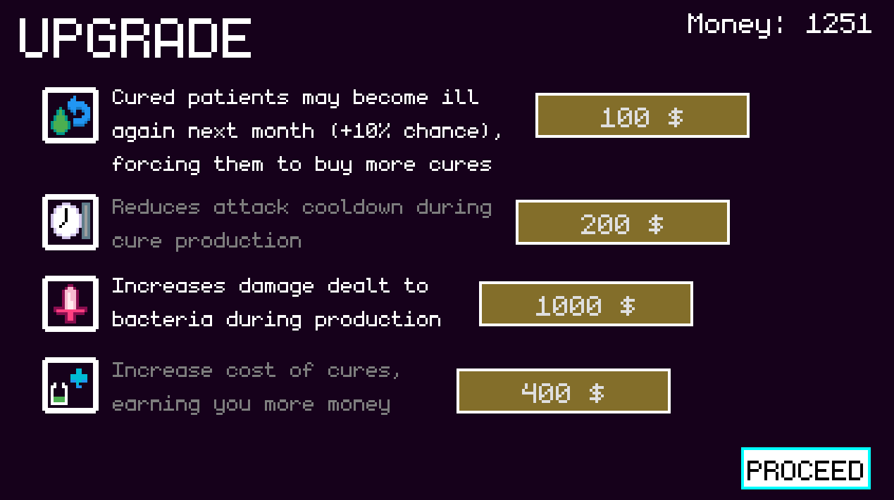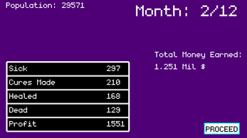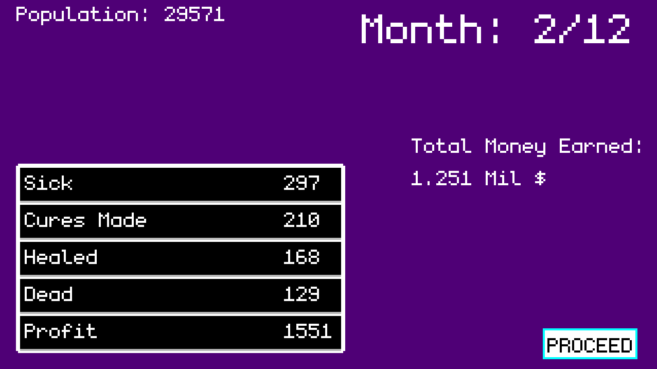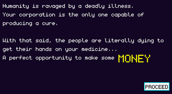 Humanity has been ravaged by a deadly disease. You have the means to produce a cure... but why should your services come cheap? This seems like a great opportunity to earn some MONEY!