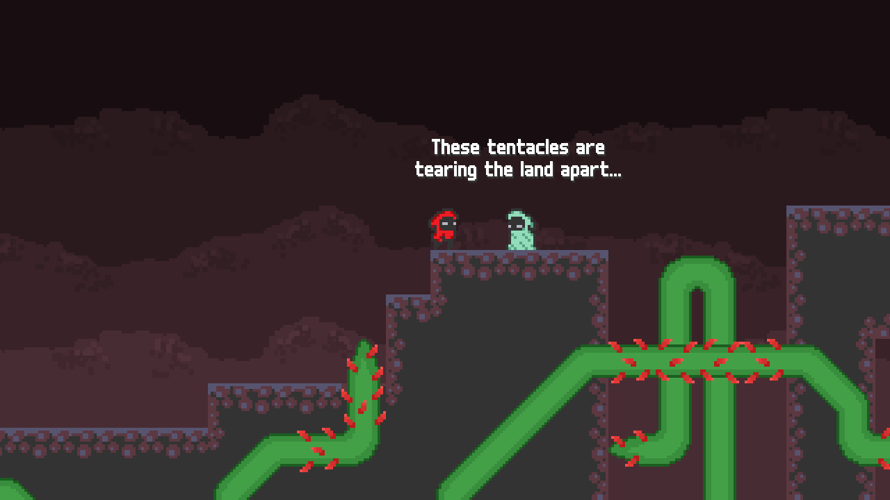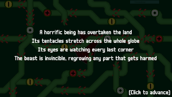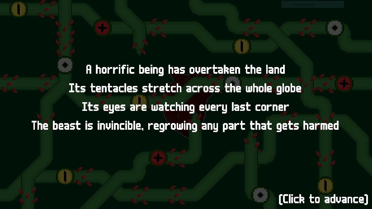 This game is a short puzzle-platformer where you have navigate around the tentacles of a world-encompassing monster. Destroy it's tentacles mindfully to complete platforming challenges and advance towards the monster's heart.