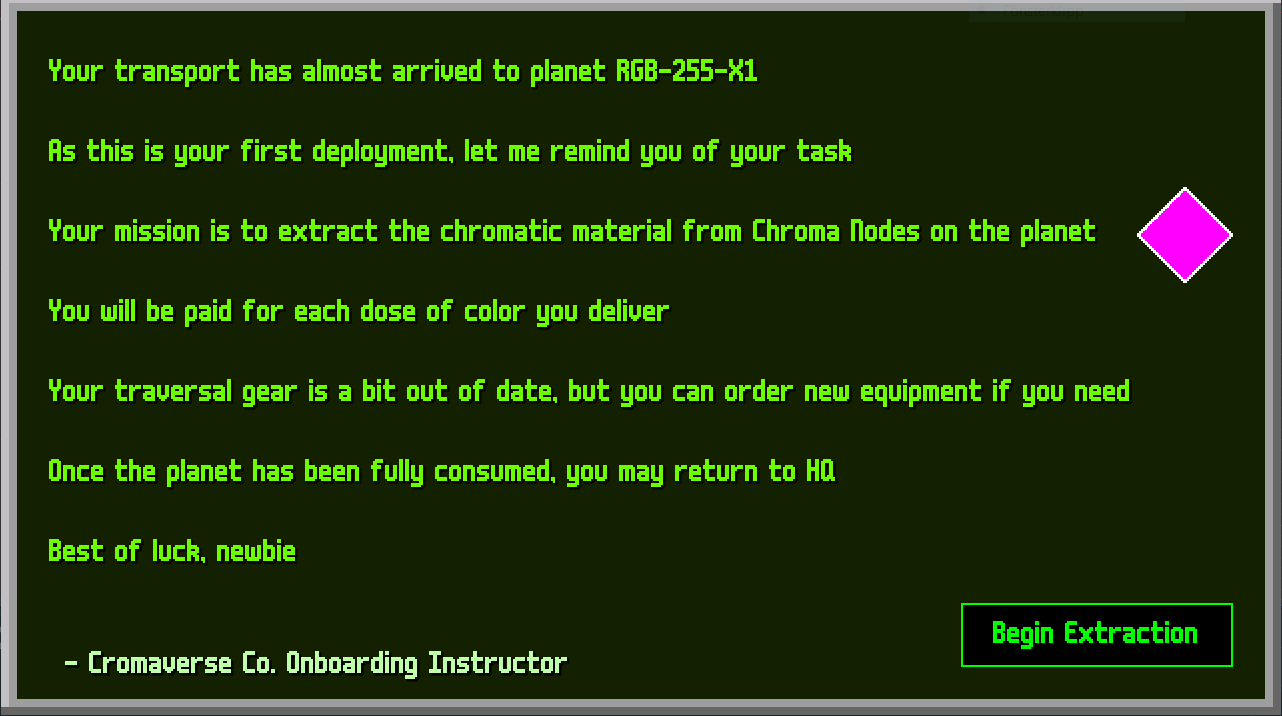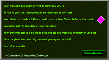 The Chromaverse Corporation has assigned you to your first job. You are tasked with surveying planet RGB-255-X1 and extracting all of its color. Use your salary to purchase new abilities that allow you to explore each corner of the planet! There are many different paths to your destinations across the world, so explore as you see fit.